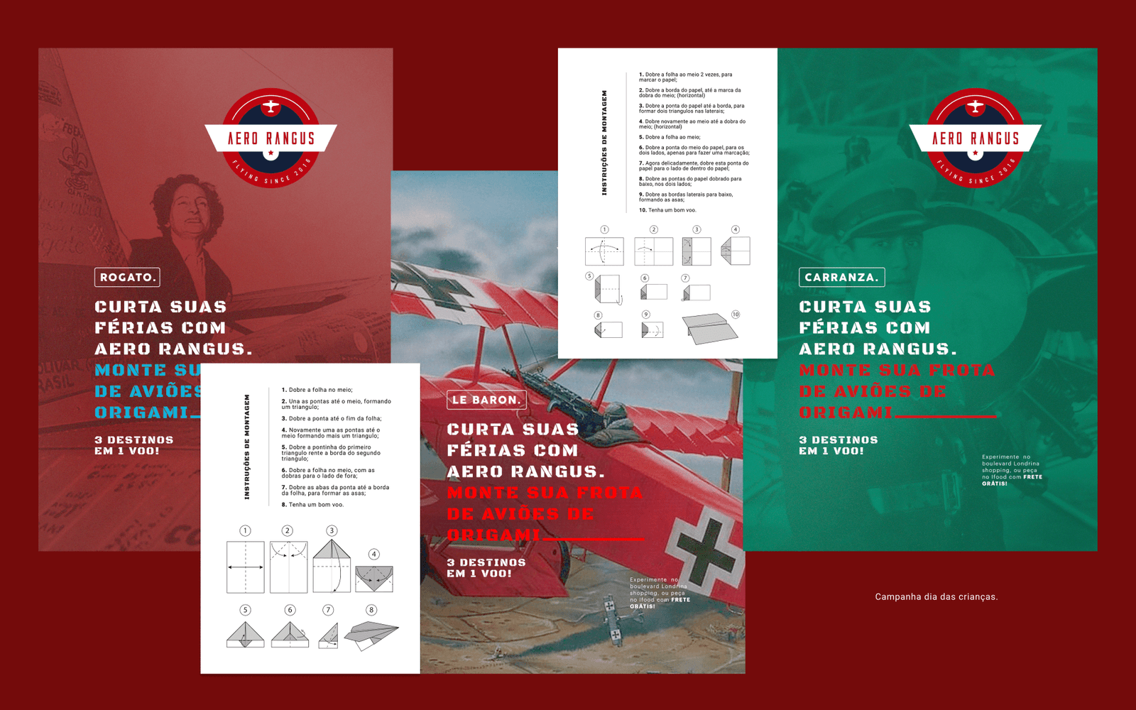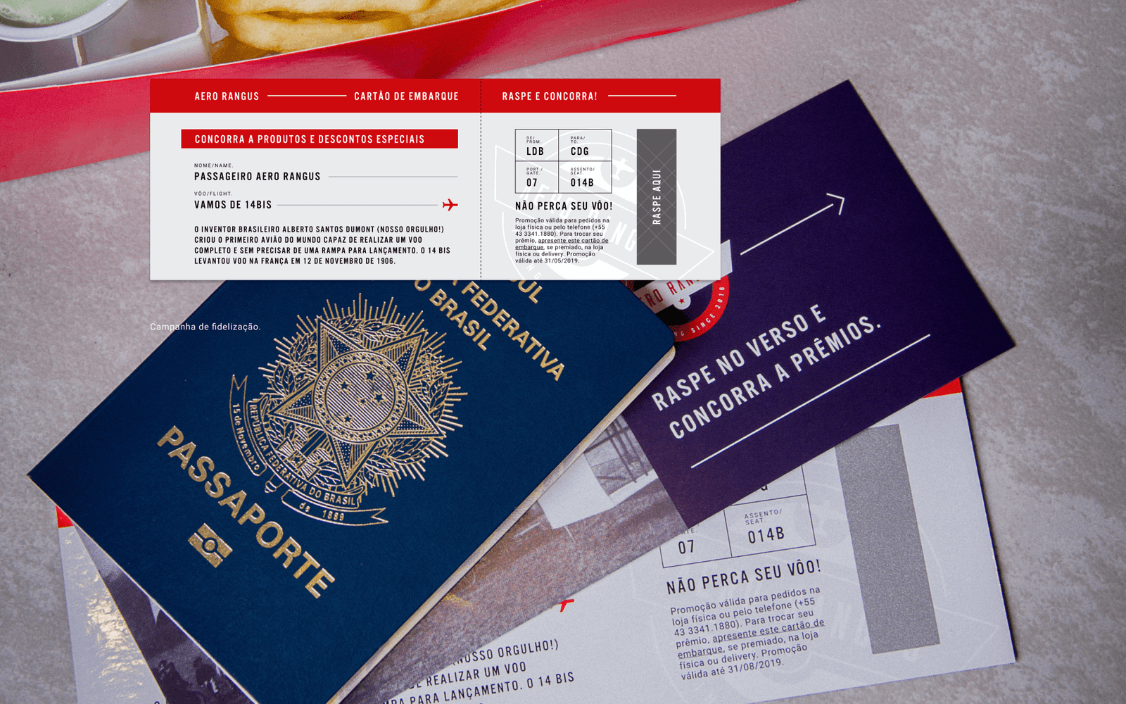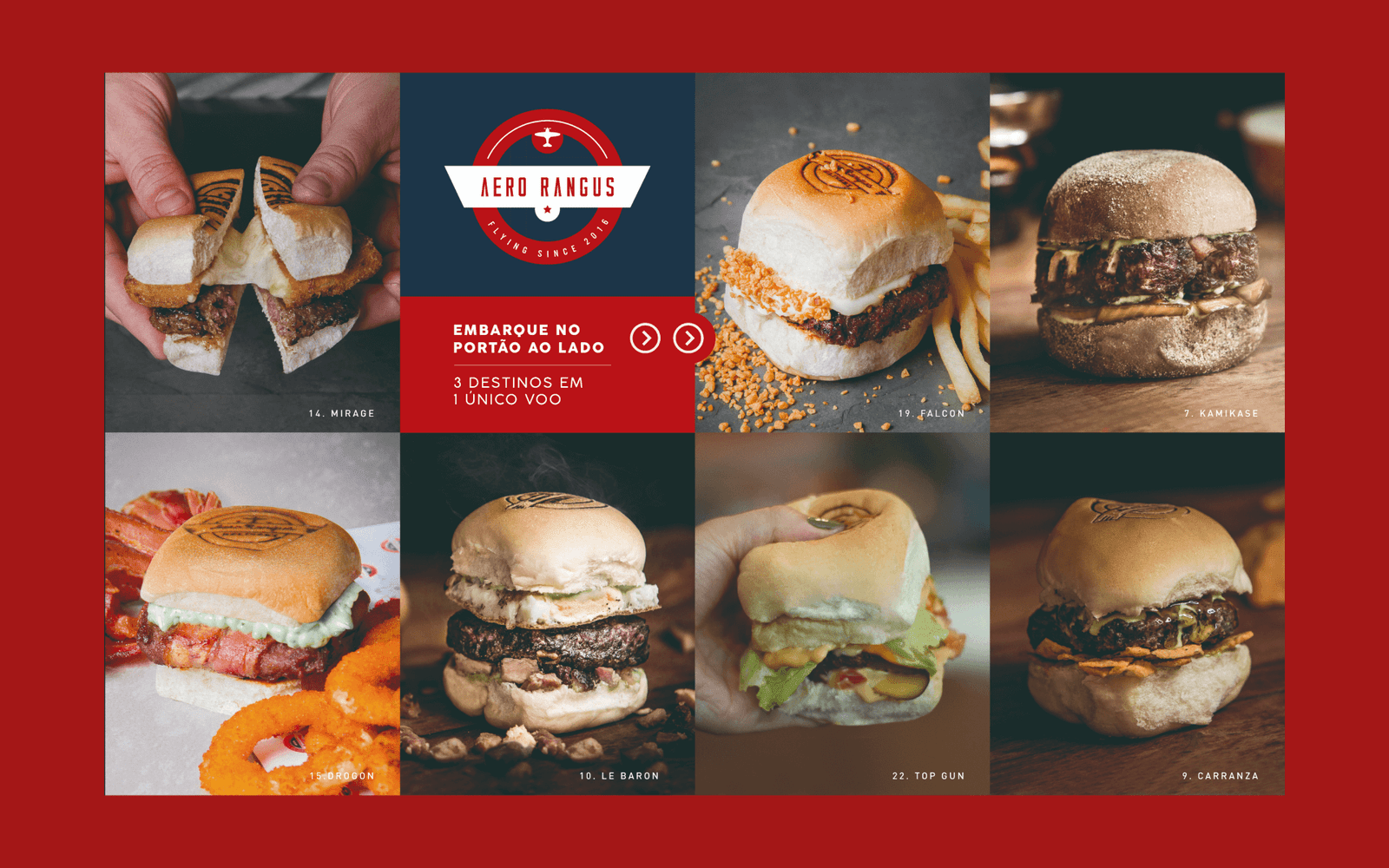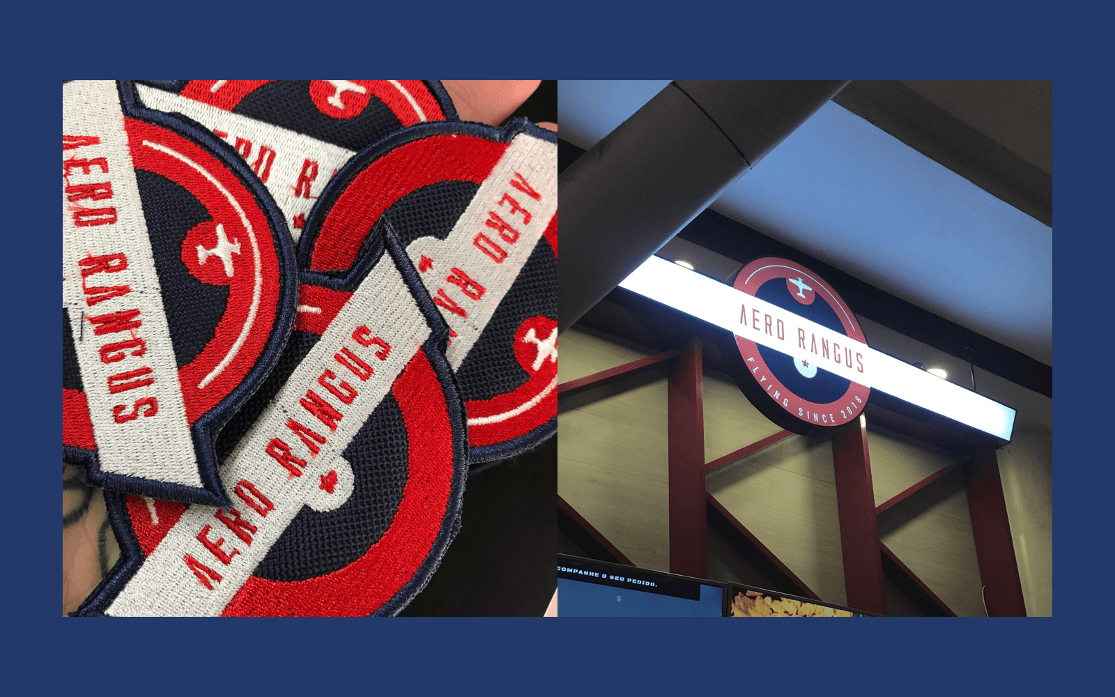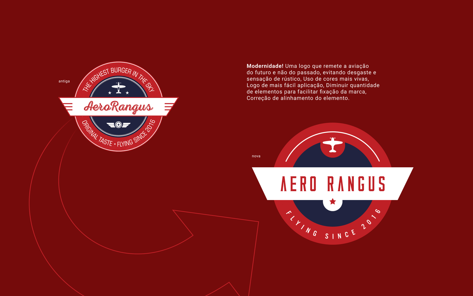 Rebranding. Design de uma nova marca para rede de restaurantes Aero Rangus. Inicialmente suas formas foram simplificadas para um aspecto mais vetorial, ainda que remetesse à aviação, mas de uma forma contemporânea evitando os aspectos vintages da marca anterior. As cores foram atualizadas para tons mais vivos na mesma paleta e a tipografia foi modificada para uma melhor aplicação e fixação da identidade.