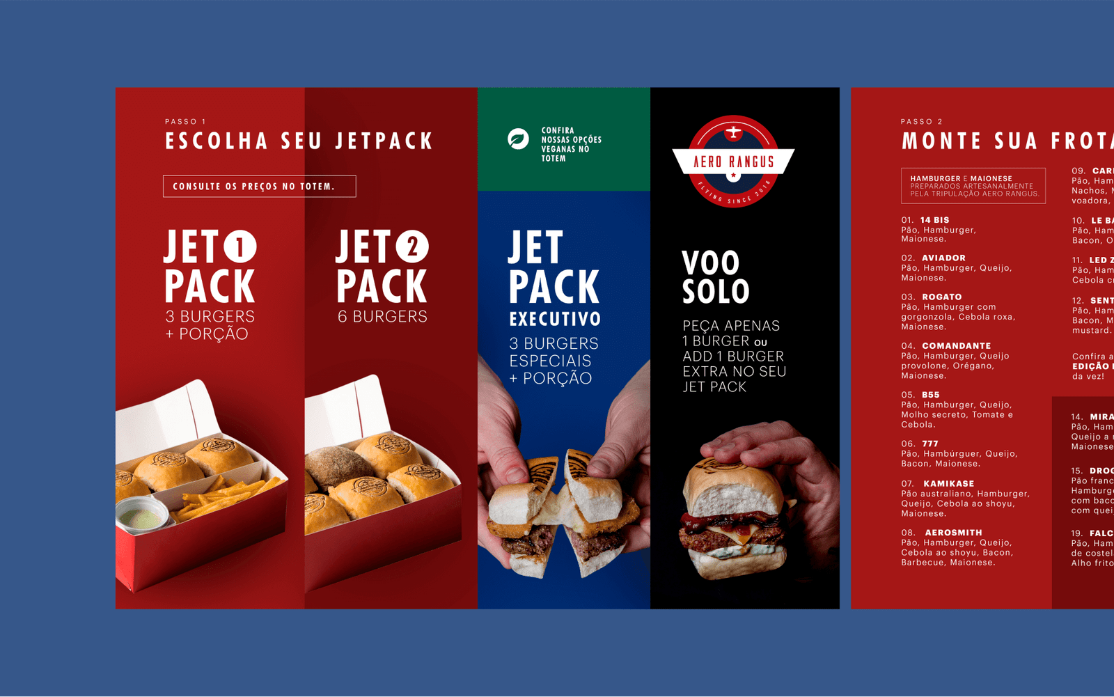 Rebranding. Design of a new brand for the Aero Rangus restaurant chain. Initially, its forms were simplified to a more vectorial look, still reminiscent of aviation, but in a contemporary way, avoiding the vintage aspects of the previous brand. The colors were updated to more vibrant tones within the same palette, and the typography was modified for better application and consistency of the identity.