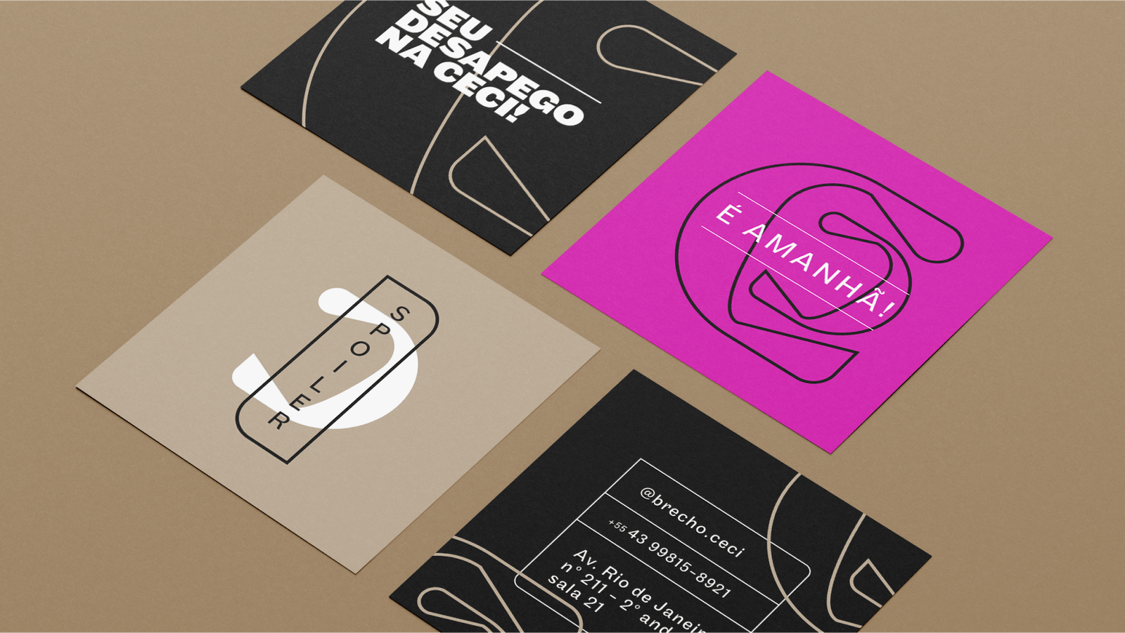Branding. Criação de identidade para um espaço focado na curadoria de peças e acessórios de moda. Com tipografia própria, criada de forma orgânica e desconstruída, a marca expressa contemporaneidade ao utilizar blocos de cores sóbrias em contraste ao magenta e o branco. Simples de ser aplicada em qualquer superfície e utilizável em meios digitais, a marca traduz aspectos de atemporalidade de peças de moda e sua reutilização.