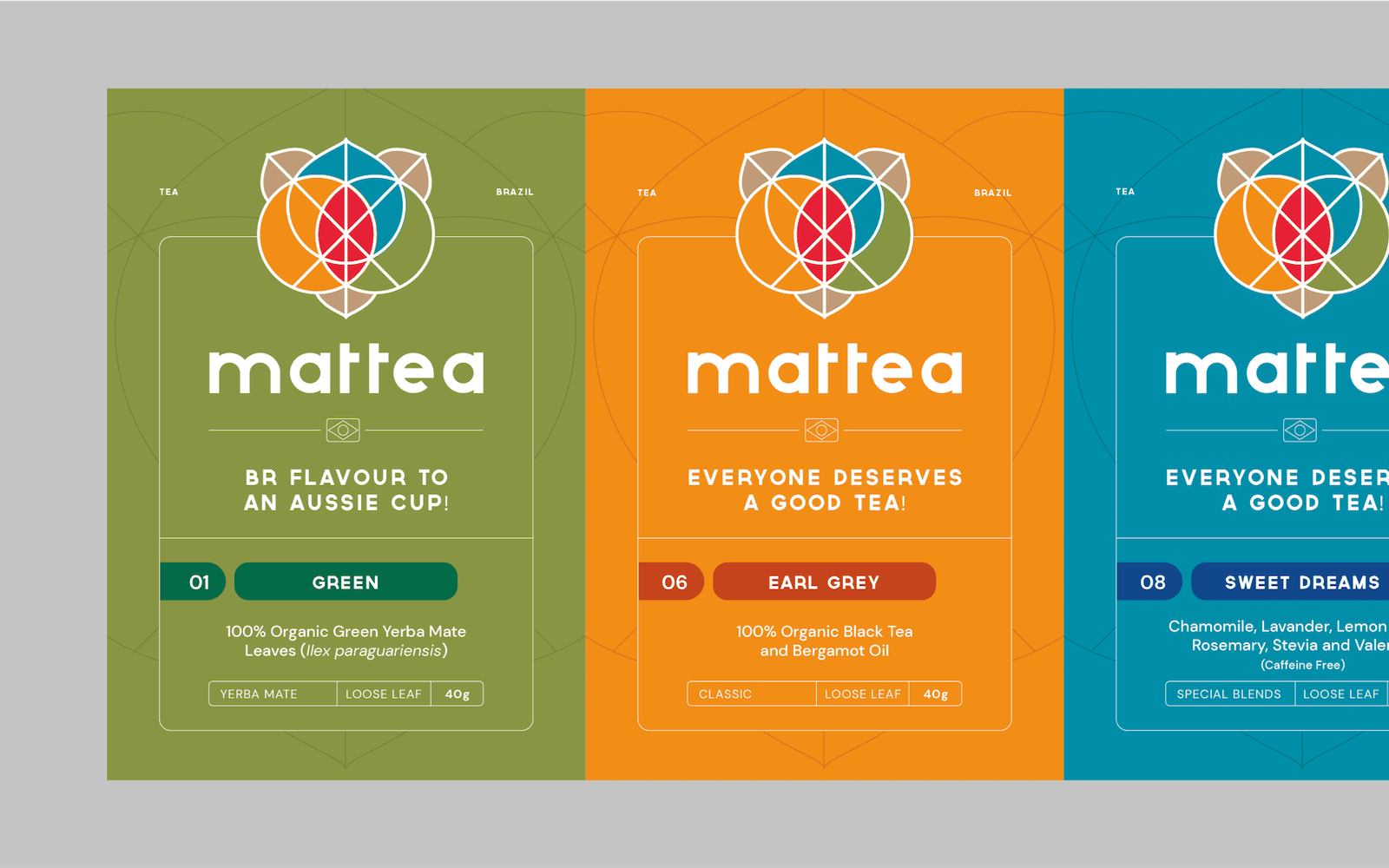 Branding. Criação de uma marca com identidade brasileira para o público australiano especializada em blends de chá originais e Erva-mate brasileira. Com paleta de cores fortes e símbolo inspirado na flor de Erva-mate, a marca tem traços que remetem à conexão entre amigos, diferentes sabores e aromas e entre natureza e humanos. Toda identidade foi pensada para ser aplicada em embalagens e em meios digitais de forma coesa e versátil.