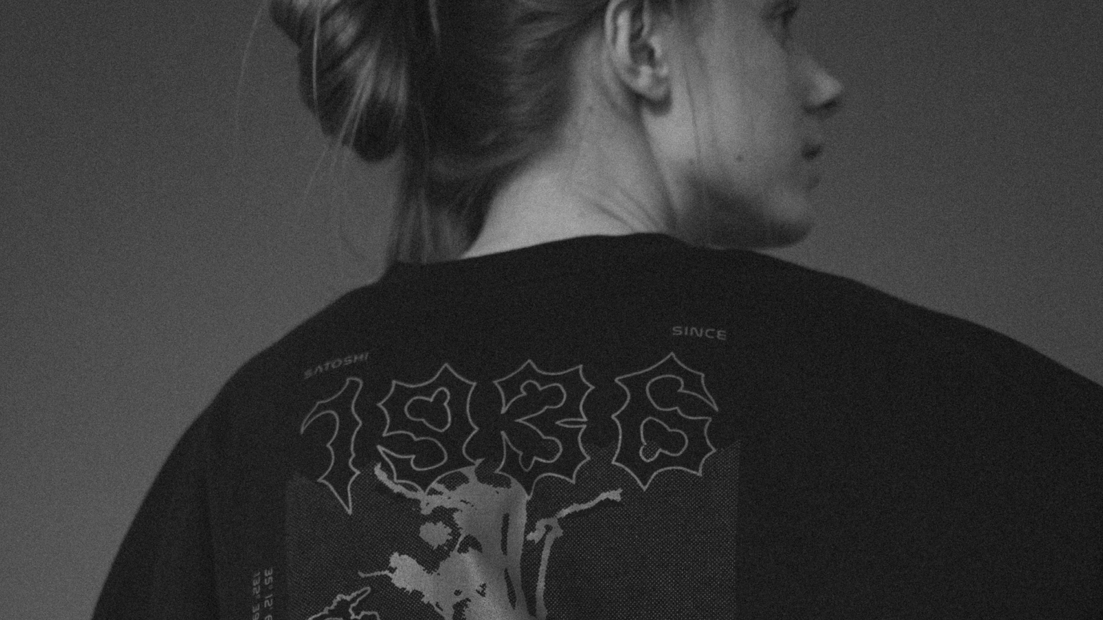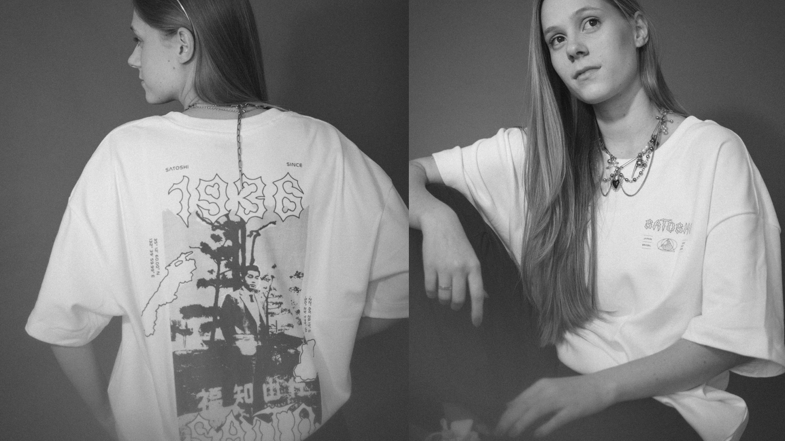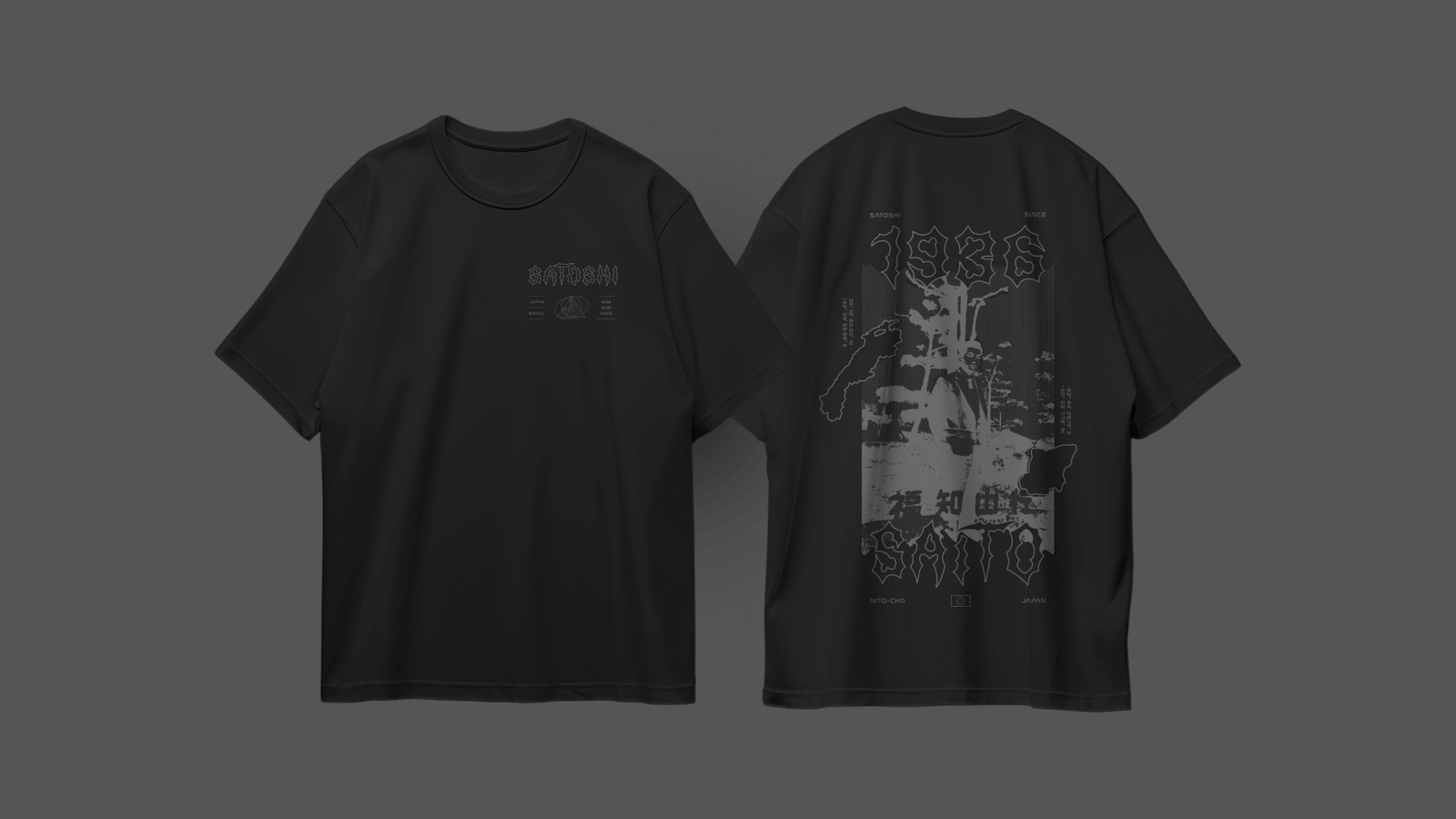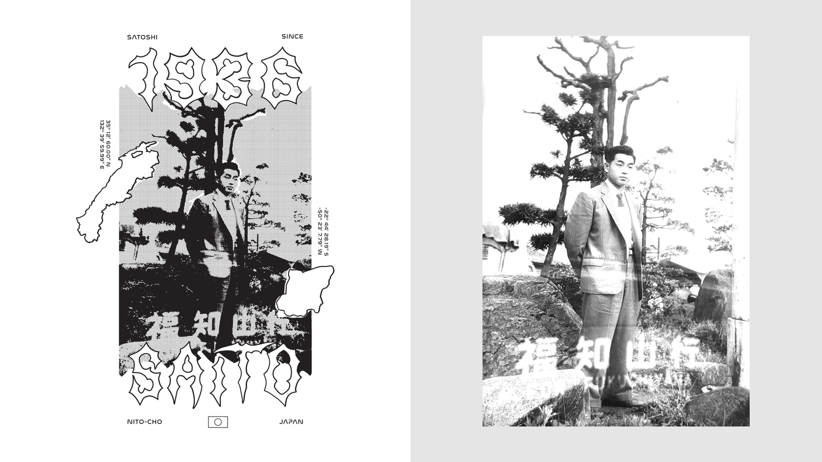 Print design. For Satoshi Gang, a silkscreen print steeped in ancestry and history was developed. The idea was to manipulate photos of Satoshi's grandfather, documents from the immigration period, and manuscripts to create a design that represented the brand's street style and identity.