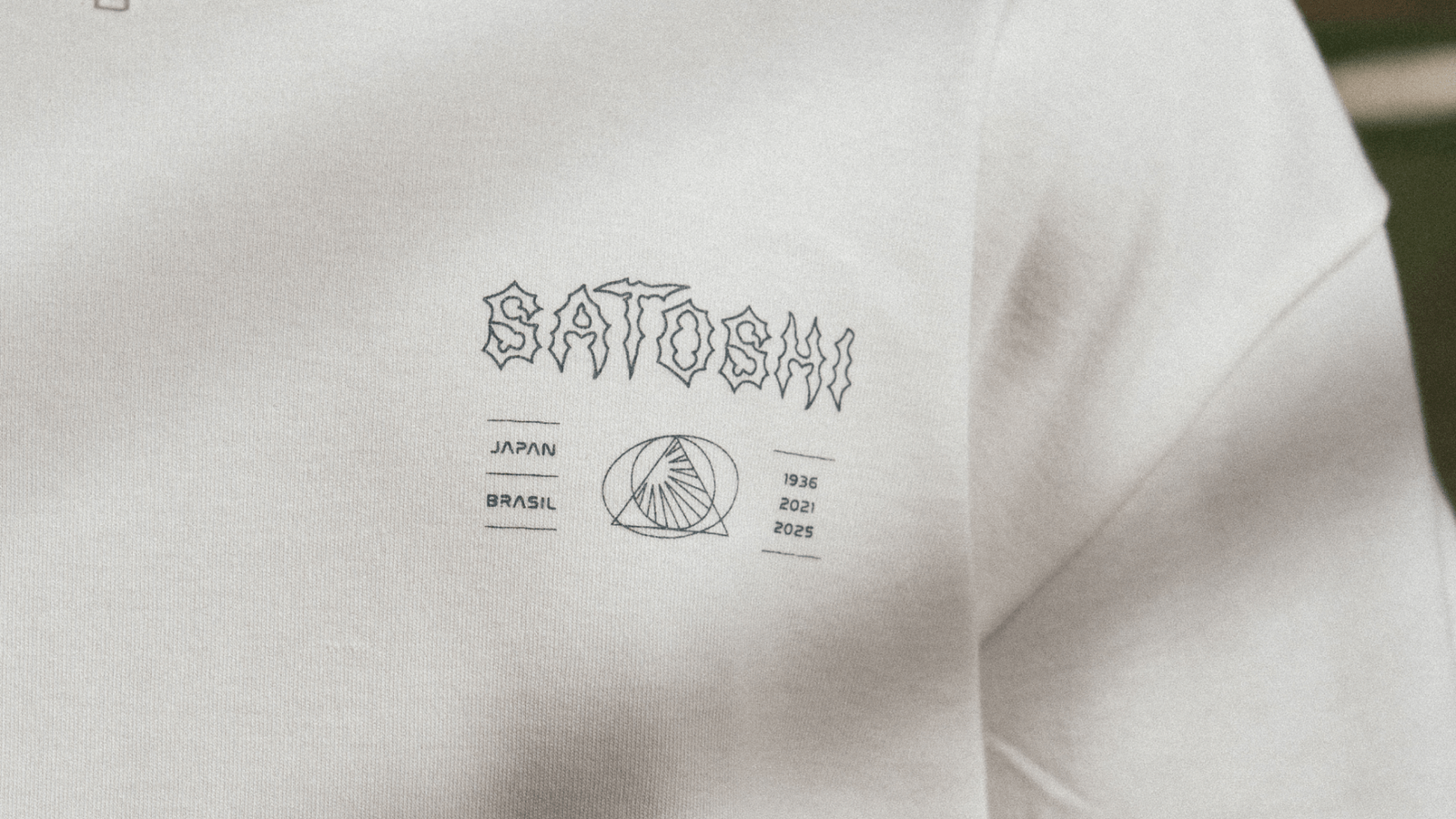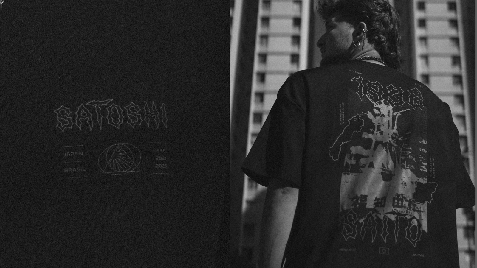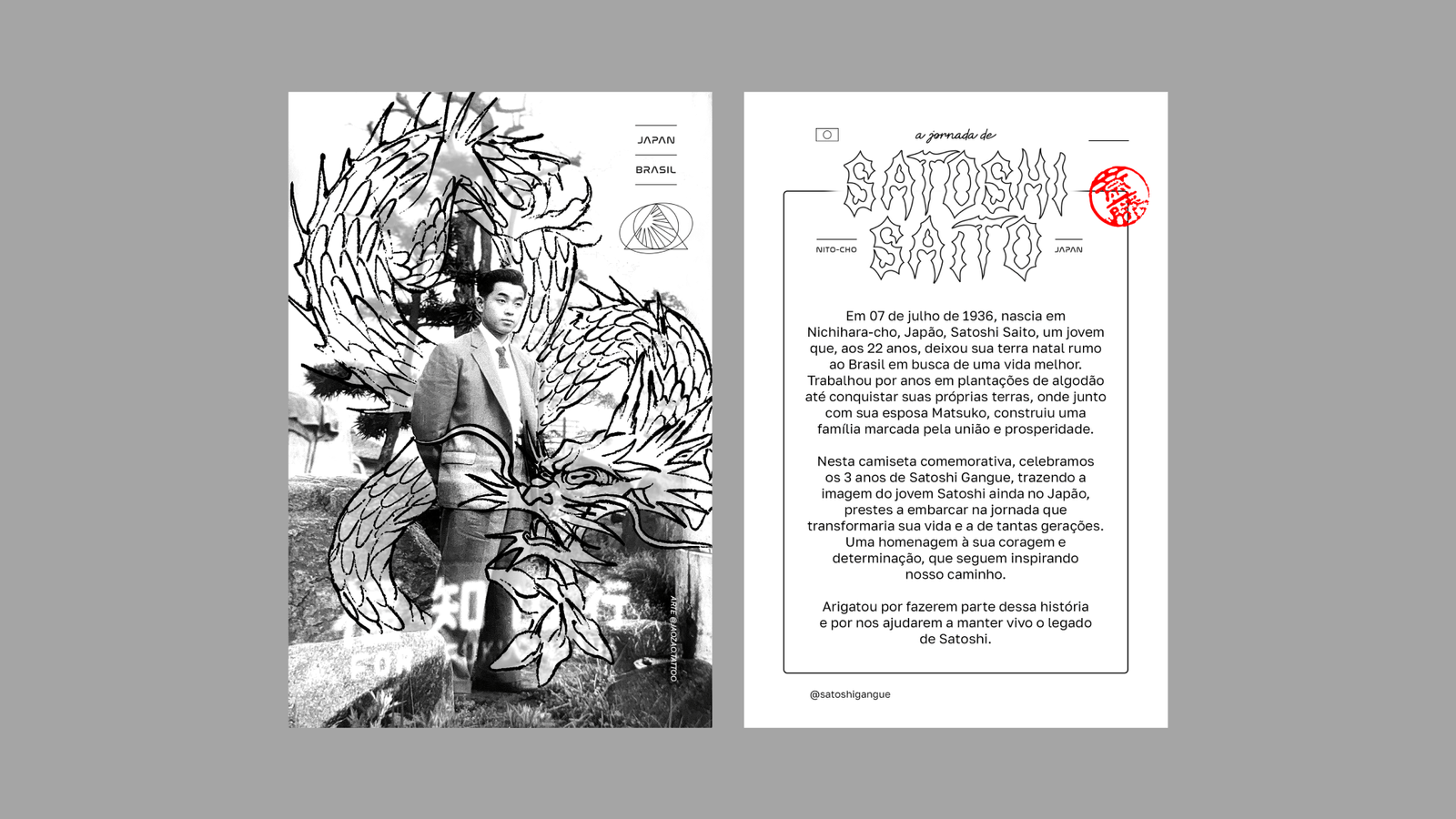 Design de estampa. Para o Satoshi Gang foi desenvolvida uma estampa em serigrafia carregada de ancestralidade e história. A proposta foi, a partir da manipulação de fotos do avô Satoshi, documentos da época da imigração e manuscritos, criar um design que representasse o street style e identidade da marca.