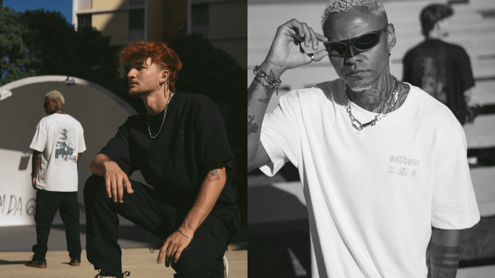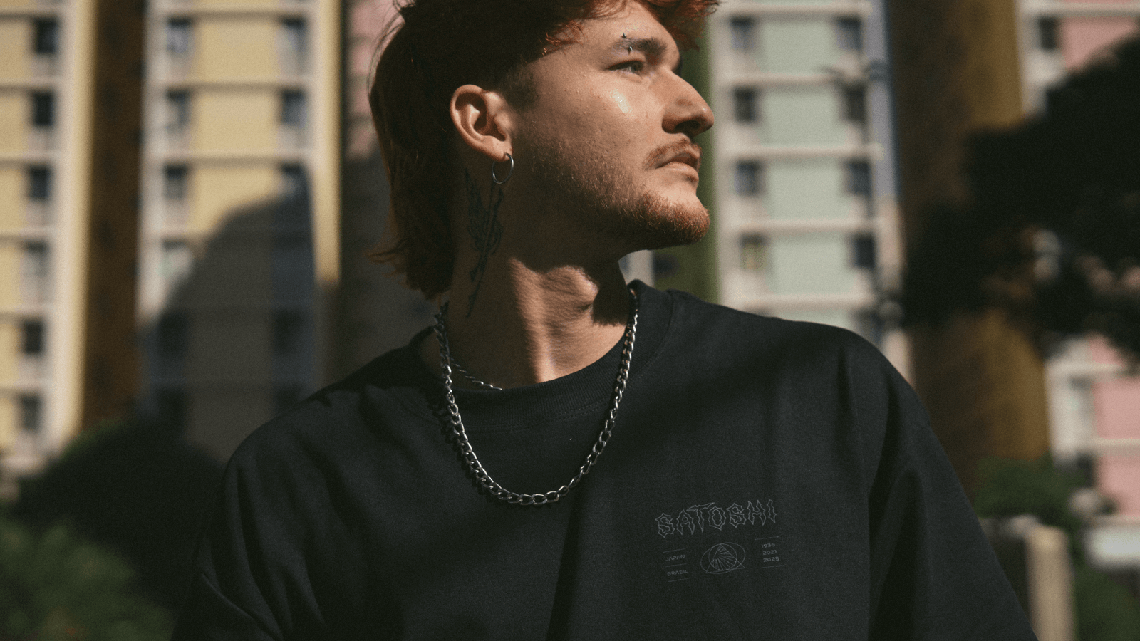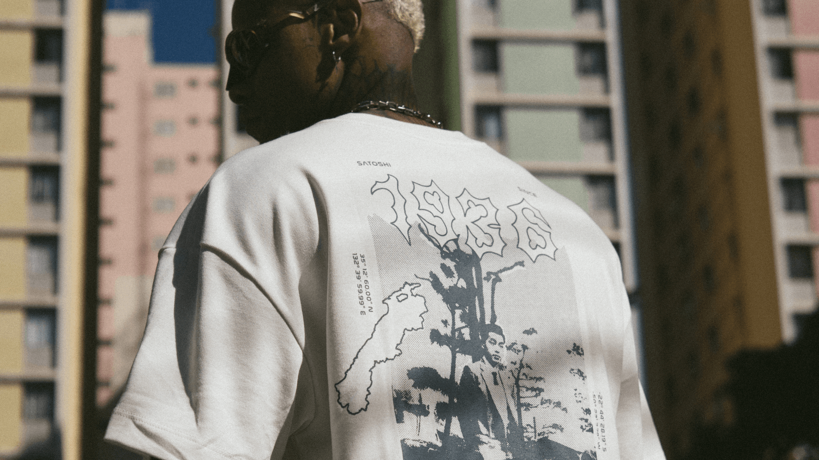 Design de estampa. Para o Satoshi Gang foi desenvolvida uma estampa em serigrafia carregada de ancestralidade e história. A proposta foi, a partir da manipulação de fotos do avô Satoshi, documentos da época da imigração e manuscritos, criar um design que representasse o street style e identidade da marca.